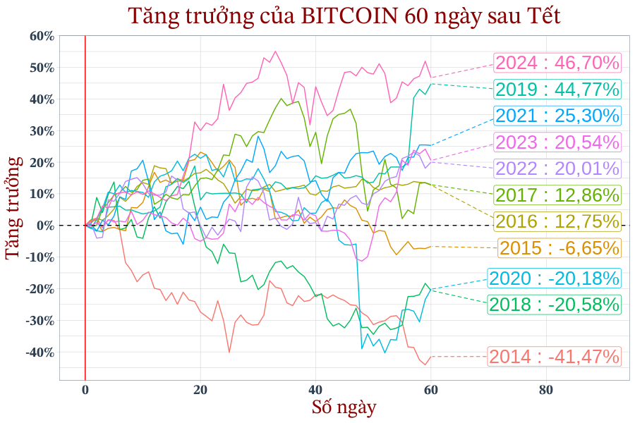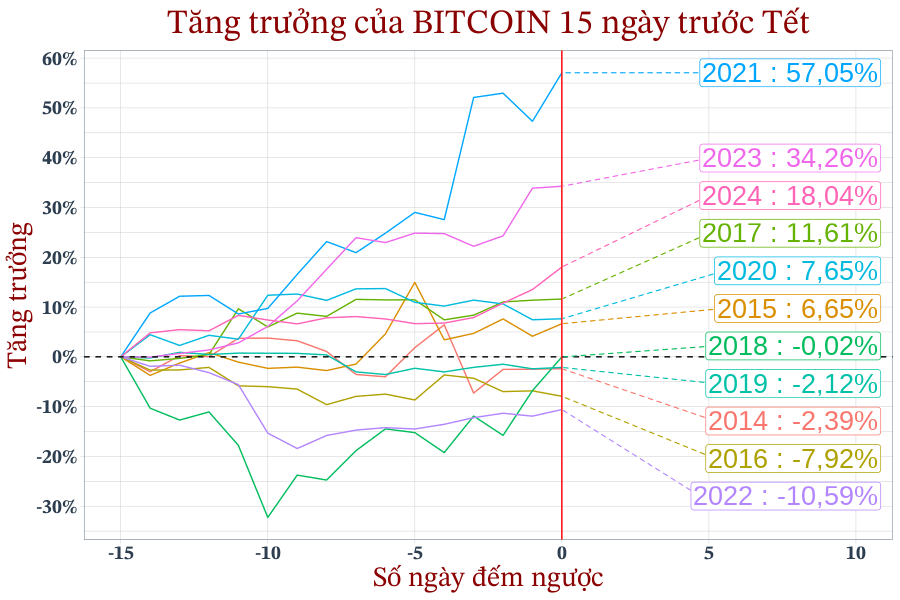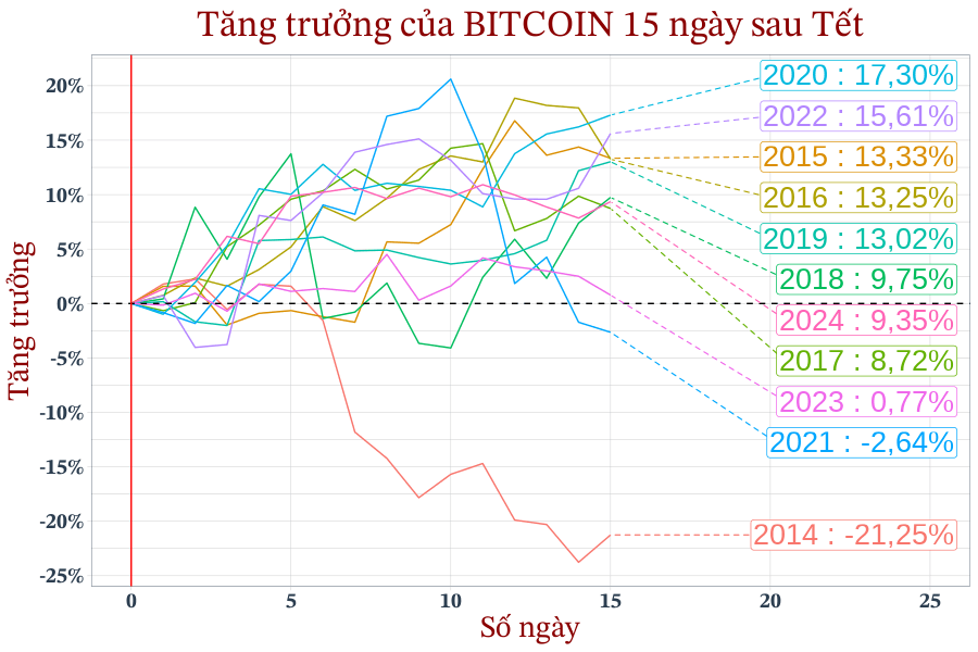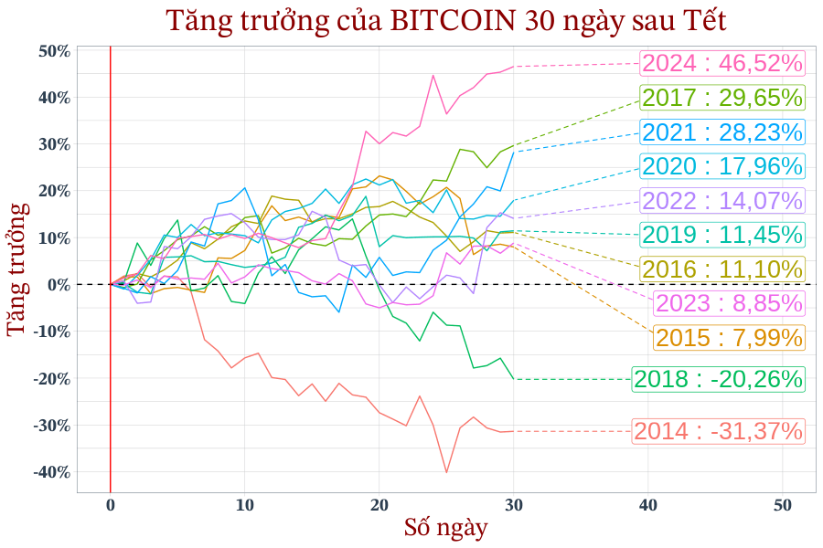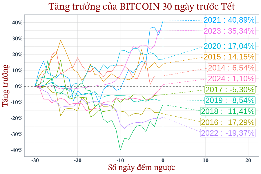 Biến động giá của Bitcoin 30 ngày trước Tết (mốc 0 - đường màu đỏ).