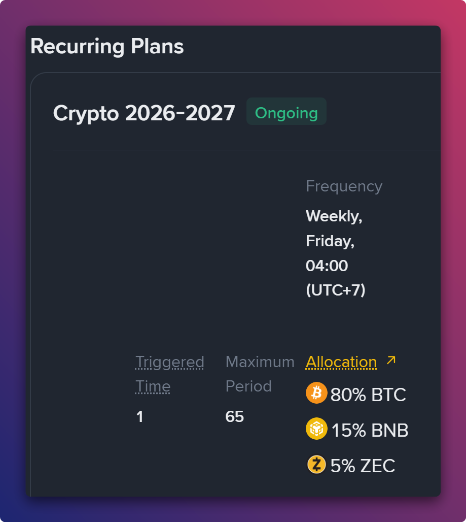 Kế hoạch của tôi không thay đổi so với những lần trước: DCA trong 1 năm rồi sau đó để im cho danh mục tự chạy. Không làm gì phức tạp.