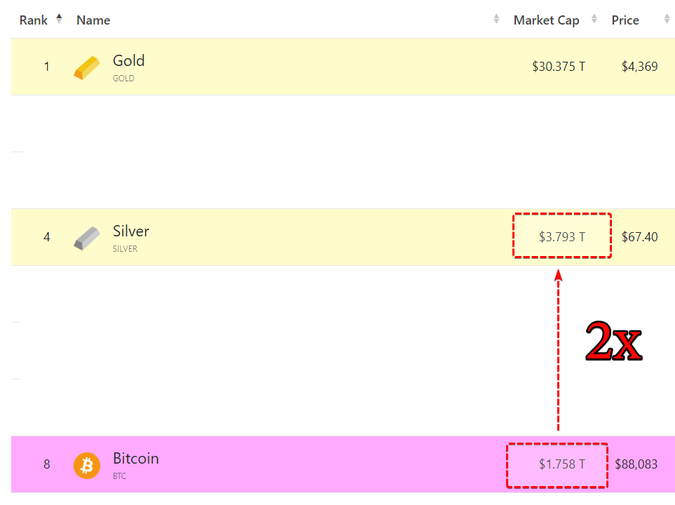 “2 năm trước vốn hóa của Bạc bằng Bitcoin, bằng 1.3T USD. Nhưng bây giờ bạc là 3.8 thì khác gì nói Bitcoin có tiềm năng x2 trong tương lai để vốn hóa của nó bằng với Bạc?”