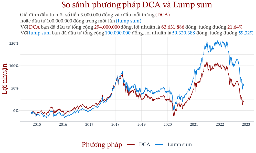 Mặc dù chỉ đầu tư 100 triệu nhưng tỷ suất lợi nhuận theo phần trăm của phương pháp Lump Sum ở đây lớn hơn nhiều so với DCA (59% so với 21%). Nếu so về số tiền lời thì cũng không chênh lệch bao nhiêu (khoảng 4 triệu).