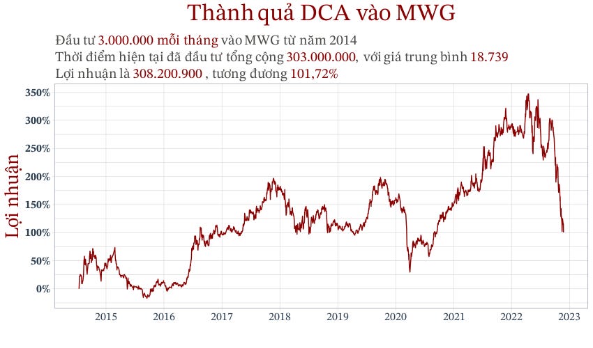 Không có một lý do cụ thể nào khi lựa chọn MWG cả. Tôi lựa chọn vì dữ liệu đủ dài và là một cổ phiếu tăng trưởng tốt trên thị trường. Là một cổ phiếu doanh nghiệp cho nên rủi ro cũng sẽ lớn hơn ETF.