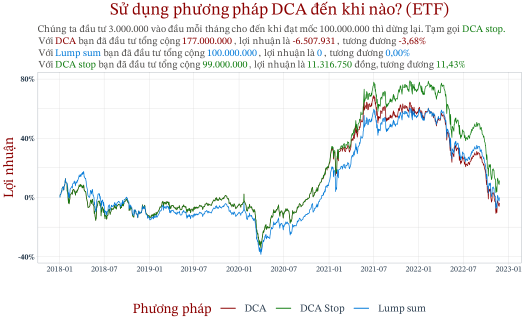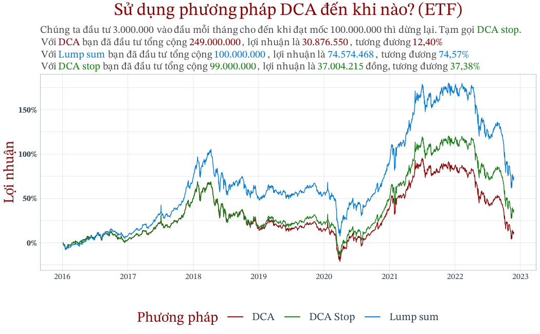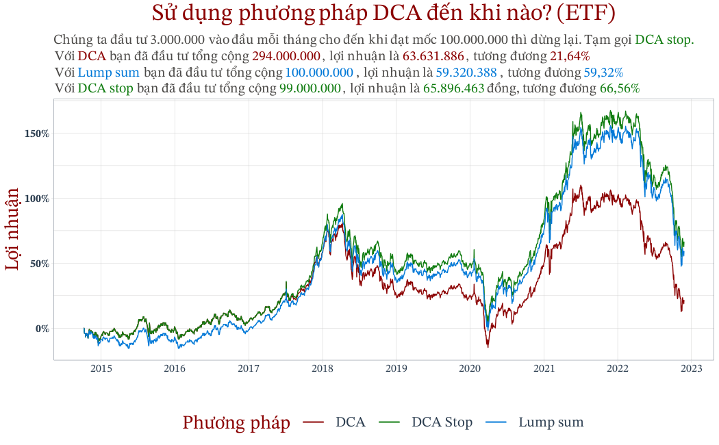 Đầu tư 3.000.000 đồng mỗi tháng, khi số tiền đầu tư này đạt tới mốc 100 triệu thì dừng lại và để danh mục tự "chạy" (tạm gọi DCA Stop)