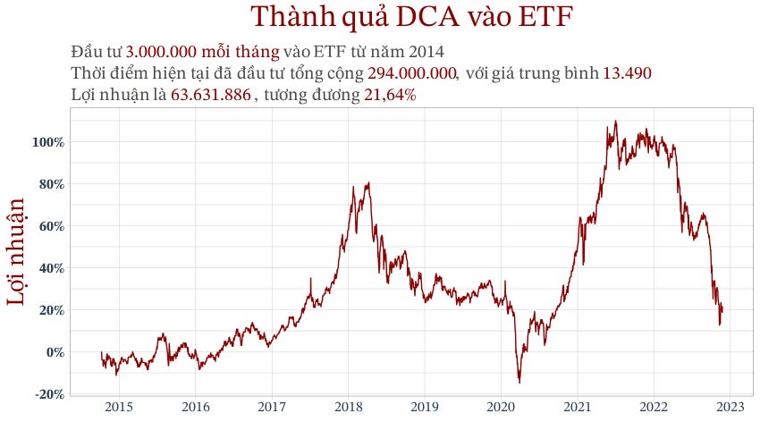 Số tiền đầu tư cũng tương đương ETF. Sau 8 năm đầu tư thì có lợi nhuận 300 triệu, tương đương 101,72%.