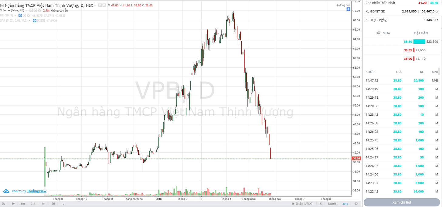 Như bạn đã biết, hiện tại VNINDEX đang điều chỉnh, nhiều cổ phiếu đang giảm sâu so với giá đỉnh. VPB cũng tương tự. Cuối phiên 28/05/2018, VPB đã giảm sàn ở mức giá 38.800 đồng, giảm 44,5% so với đỉnh.
