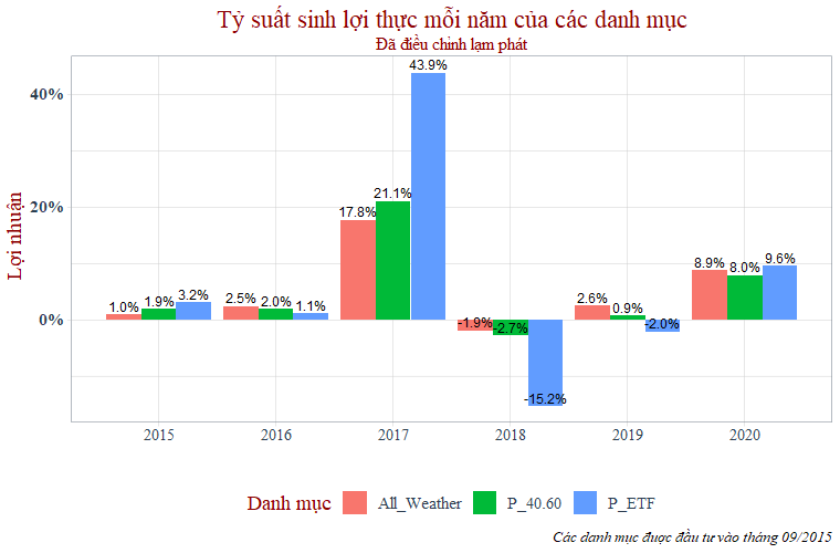 Bắt đầu từ tháng 09/2015 thì danh mục All Weather mang lại tỷ suất sinh lợi gộp hằng năm (đã điều chỉnh lạm phát) là 5,72%% mỗi năm. Trong khi đó danh mục 40/60 là 5,63%% và danh mục ETF là ~ 5,57% mỗi năm.