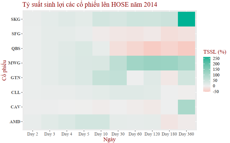 Với dữ liệu 77 cổ phiếu niêm yết trên HOSE. Tôi có danh sách các cổ phiếu an tâm nắm giữ trong suốt thời gian kể từ ngày niêm yết lần đầu tiên: MWG và CAV (năm 2014), TVS và CSV (năm 2015), S4A (năm 2016), CTF và VJC (năm 2017), AST, FIR, HPX và VPG (năm 2018). Tổng cộng 11/77 cổ phiếu. Tỷ lệ để chọn ra đúng một cổ phiếu để "ôm" dài hạn rất thấp.