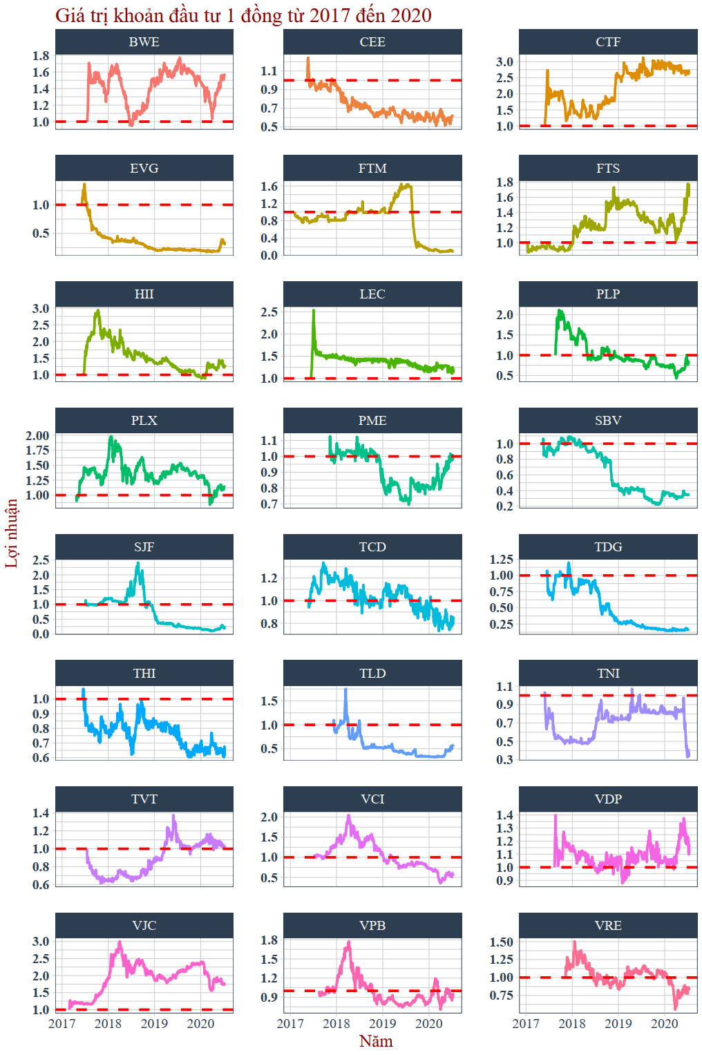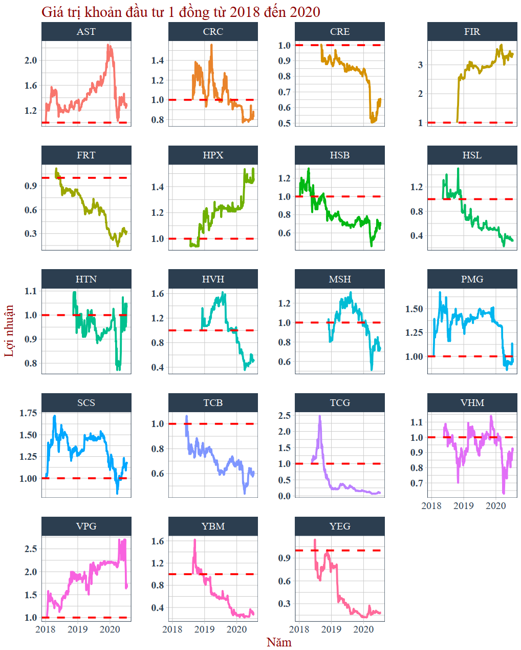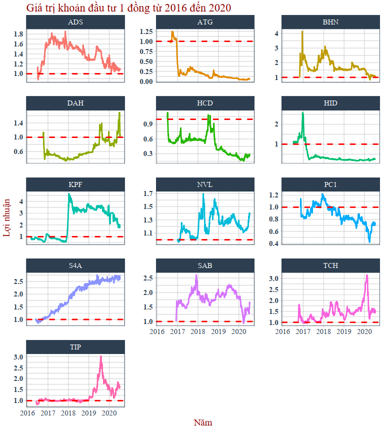 Bây giờ ta thử giả định đầu tư từng cổ phiếu để xem những cổ phiếu này có tiếp tục duy trì sự tăng trưởng cũng như giảm điểm không.