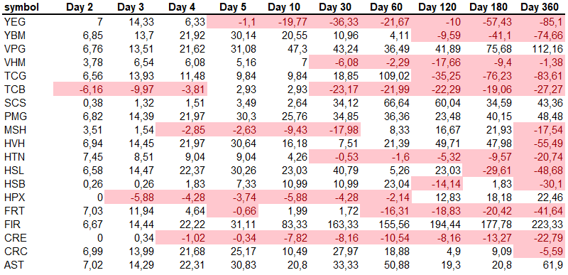 Còn các cổ phiếu mà có xu hướng giảm ngay từ ngày thứ 2, hoặc ngày 5-ngày 10 thì sẽ duy trì xu hướng giảm đến ngày thứ 360, như: EVG, TDG, TLD, VPB. Trong đó có các trường hợp ngoại lệ như: PLP, FTS và FTM "xanh" nhưng sau đó lại giảm.