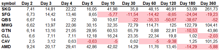 Cho tới giai đoạn này thì việc giá cổ phiếu tăng trưởng vào ngày thứ 5 và 10 không còn có thể dùng để phát đoán xu hướng tăng trưởng trong tương lai nữa. Do có: YBM, TCM, HVH, HTN HSL. Đây là các cổ phiếu giá tăng liên tục vào ngày thứ 5-10, và 30 nhưng vào ngày thứ 360 thì lại giảm thấp hơn cả giá của ngày giao dịch lần đầu tiên.