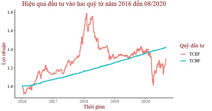 Như vậy ta thấy rằng, nếu lựa chọn đầu tư vào quỹ mở cổ phiếu TCEF vào năm 2016 đến nay thì lợi nhuận không bằng đầu tư vào quỹ mở trái phiếu TCBF. Tuy nhiên, có giai đoạn năm 2017 đến 2018 thì lợi nhuận mà quỹ mở cổ phiếu TCEF mang lại lớn hơn TCBF rất nhiều.