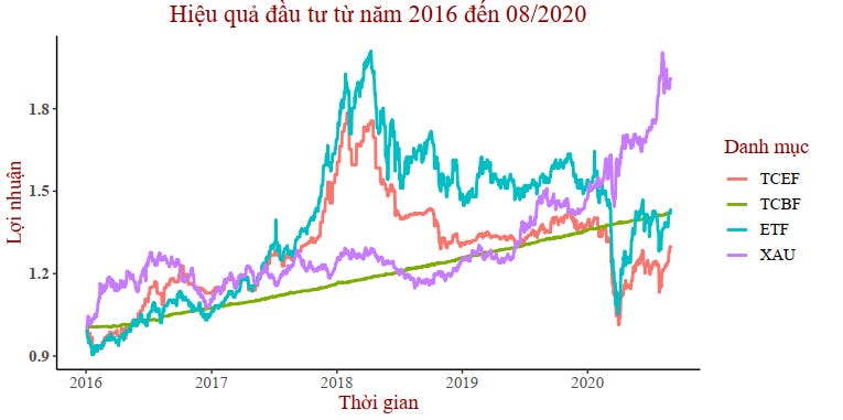 Nếu đầu tư 100% vàng vào năm 2016 thì đến thời điểm hiện tại danh mục này mang lại lợi nhuận lớn nhất cho nhà đầu tư. Tuy nhiên nếu xét thời điểm 2016 -> 2018 thì đầu tư vào ETF lại mang về lợi nhuận lớn nhất. Suy cho cùng, lời/lỗ phụ thuộc vào thời điểm và quãng thời gian đầu tư. Trước mắt, nếu là một nhà đầu tư e ngại rủi ro và mong muốn đầu tư dài hạn thì Vàng là lựa chọn tốt.