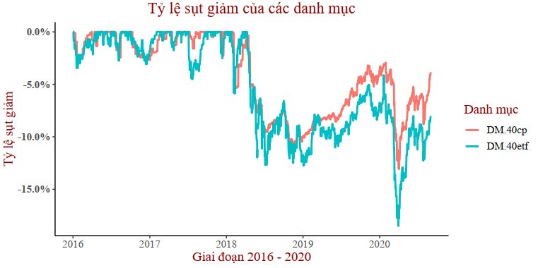 Và bởi vì độ lệch chuẩn lớn nên danh mục 40etf.60v này có tỷ lệ sụt giảm vốn từ đỉnh là lớn nhất trong số 4 danh mục. Ta thấy TSSL của danh mục này thấp hơn TSSL của danh mục 40cp.60v trong 3 năm 2016, 2019 và 2020, và rủi ro lại lớn hơn. Vì thế mà tỉ số Sortino của danh mục này thấp hơn 40cp.60etf, chứng tỏ rủi ro gánh chịu thêm của danh mục này không cần thiết.