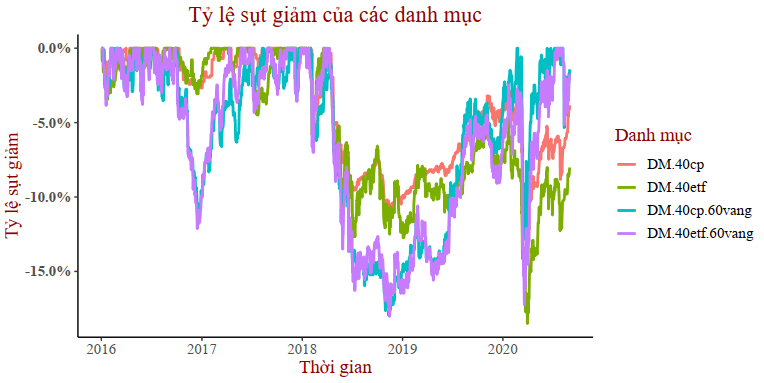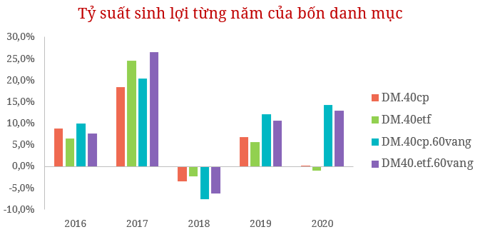 Sau khi thị trường chứng khoán điều chỉnh thì hầu hết 4 danh mục đều giảm. Trong đó, danh mục đầu tư vào 40%ETF và 60% Vàng giảm mạnh nhất. Nhưng bắt đầu từ năm 2020 trở đi khi giá vàng tăng mạnh thì hai danh mục đầu tư vào vàng lại được hưởng lợi.