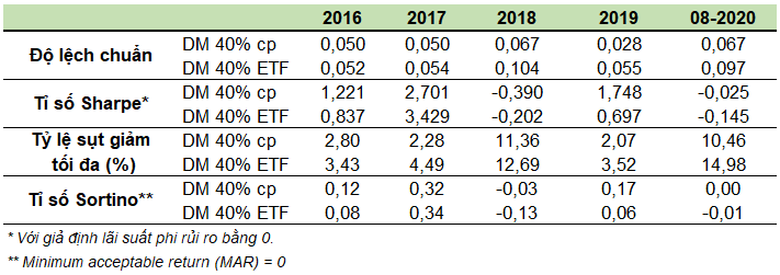 Bảng trên nhằm cung cấp thông tin về độ lệch chuẩn (rủi ro), tỉ số Sharpe (lợi nhuận vượt trội trên một đơn vị rủi ro), tỷ lệ sụt giảm tối đa (Maximum Drawdown) và tỉ số Sortino theo từng năm.