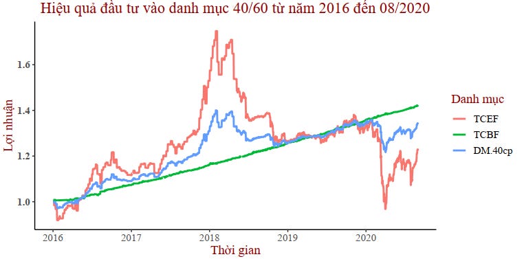 Bây giờ so sánh hai danh mục này với hai danh mục có đầu tư 60% tài sản vào quỹ trái phiếu TCBF.