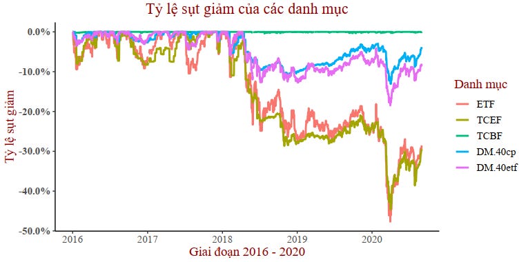 Tuy nhiên, danh mục 40% ETF này lại có mức độ sụt giảm vốn từ đỉnh (18,49%) lớn hơn so với danh mục 40% TCEF (13,08%) trong quãng thời gian từ năm 2016 đến 08/2020.