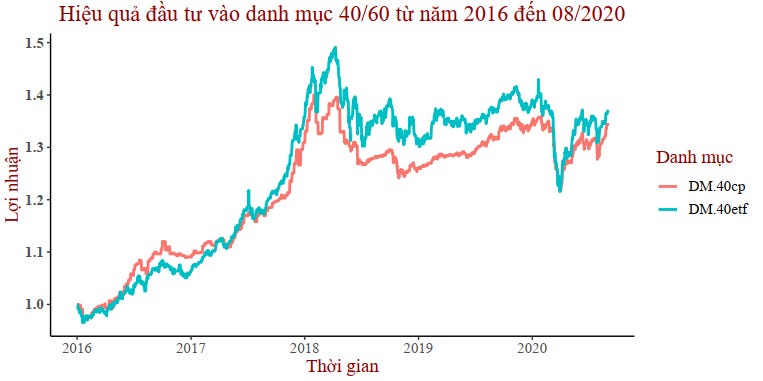 Có thể thấy rằng danh mục có đầu tư 40% vào ETF mang lại kết quả vượt trội hơn so với danh mục 40% quỹ cổ phiếu. Trong thời điểm hoảng loạn thì cả hai danh mục này đều sụt giảm như nhau.
