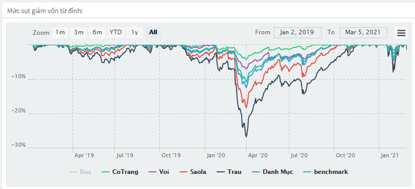 Về mức sụt giảm vốn từ đỉnh có thể thấy danh mục 40% Cò Trắng này có mức sụt giảm gần bằng với danh mục benchmark. Nhưng vẫn tốt hơn Sao La và Trâu.
