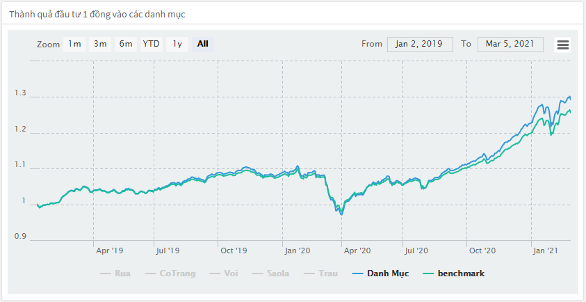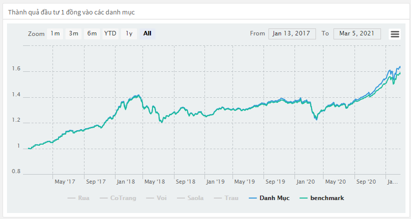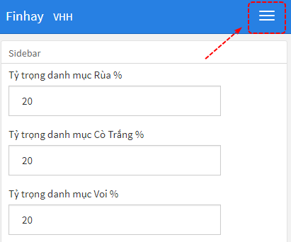 Mục tiêu ở đây là coi các danh mục đầu tư trên Finhay hoạt động như thế nào. Đồng thời cho phép người dùng giả định tỷ trọng đầu tư vào 5 danh mục đó..