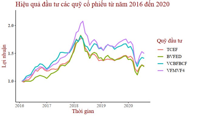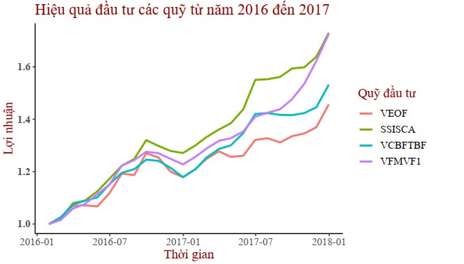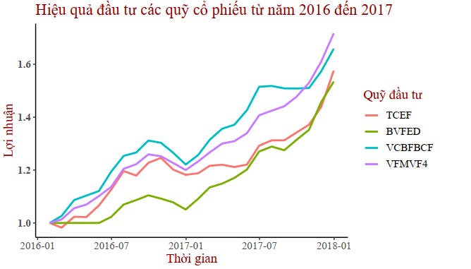 Trong suốt quãng thời gian từ 2016 đến cuối năm 2017, quỹ cổ phiếu của VCB (VCBFBCF) mang lại tỷ suất sinh lợi hầu như là tốt hơn ba quỹ còn lại. Nhưng đến cuối năm thì quỹ cổ phiếu VFMVF4 của VFM đã vượt lên.