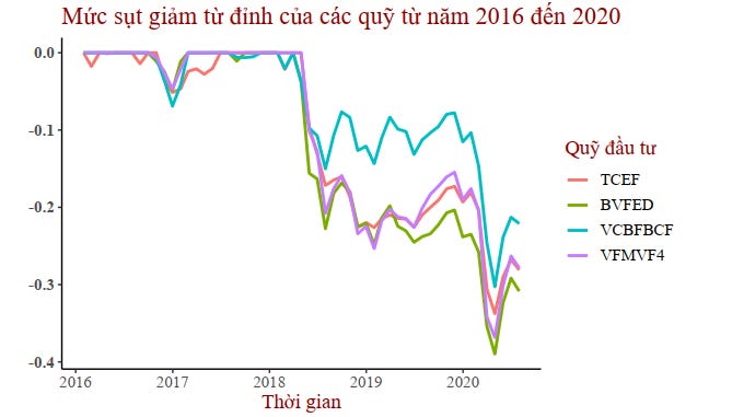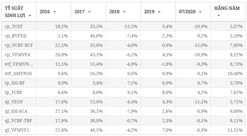 Ta có thể thấy rằng mức độ sụt giảm về giá của các loại quỹ lai thấp hơn các quỹ cổ phiếu. Ví dụ VCBFTBF và VFMVF1. Mặc dù quãng thời gian 2016 - 2018 VFMVF1 mang lại tỷ suất sinh lợi cao nhưng sang giai đoạn 2018 - 07/2020 thì lại giảm thấp (tốt) hơn các quỹ lai khác.