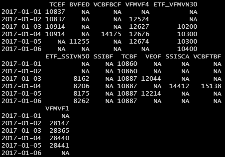 2 - Về việc lấy dữ liệu: Dữ liệu được thu thập từ trang web của các quỹ. Trong đó họ không cập nhật giá NAV liên tục hằng ngày mà họ cập nhật theo một quãng thời gian nhất định cho nên dữ liệu sẽ có dạng như vầy: