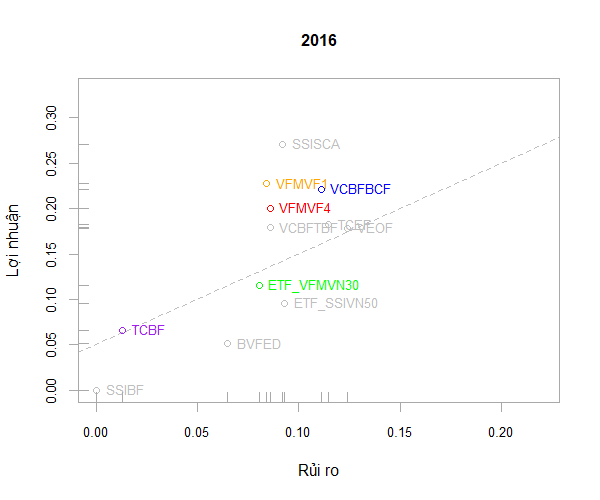 Bây giờ tôi thấy biểu đồ nó rối lắm rồi nhưng mà ta vẫn có thể nhận diện được vài cá nhân xuất sắc: Quỹ lai VFMVF1 của VFM, mang lại tỷ suất sinh lợi tốt nhất. Kế đến là quỹ cổ phiếu VFMVF4 cũng của VFM. Quỹ lai SSI-SCA của SSI.