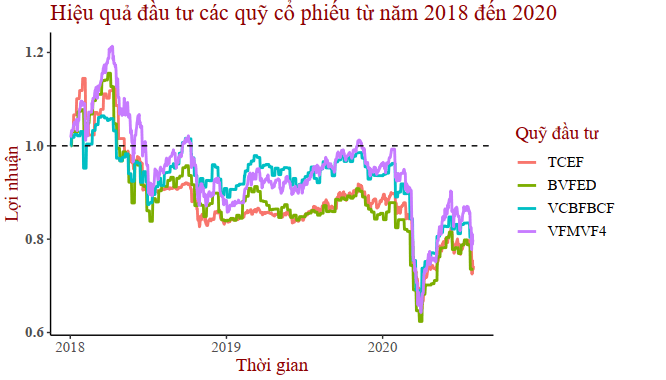 Tuy nhiên, nhìn sơ qua thì ta có thể tạm nhận xét rằng việc đầu tư vào TCEF và BVFED không hiệu quả do lợi nhuận mang lại cho nhà đầu tư thấp. Dựa vào biểu đồ [2018 -> 2020], quãng thời gian 2018 đến 2019, đầu tư vào hai quỹ này còn bị lỗ nhiều hơn. Trong khi đó thì VFMVF4 và VCBF-BCF mặc dù có lỗ nhưng cũng không nhiều.