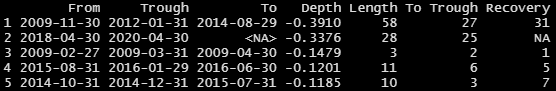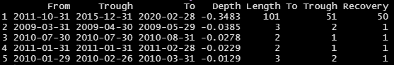 Trước hết là xem drawdown của các danh mục. Drawdown là mức sụt giảm vốn sâu nhất trong quá trình đầu tư. Được tính từ đỉnh cho tới đáy của danh mục. Bất cứ khi nào mà tỷ suất sinh lợi gộp giảm thấp hơn đỉnh thì được gọi là drawdown và sẽ kéo dài cho đến khi chạm lại đỉnh cũ. Bởi vì tính từ đỉnh xuống điều này không phản ánh rằng danh mục đang lời hay lỗ.