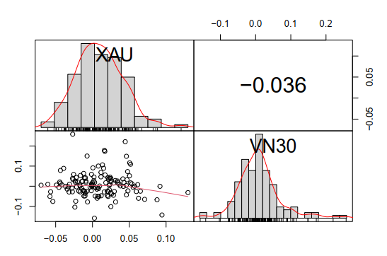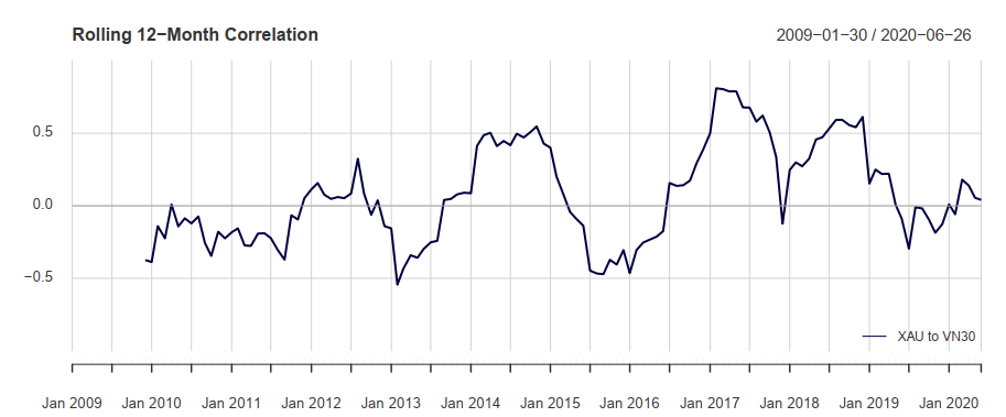 Hệ số tương quan giữa tỷ suất sinh lợi trung bình tháng của Vàng và VN30 là -0,036, có thể nói là không có mối tương quan nào. Ngoài ra cũng thấy rằng rủi ro khi đầu tư vào vàng trong quãng thời gian từ 2009 đến nay thấp hơn VN30, và vì rủi ro thấp cho nên tỷ suất sinh lợi kỳ vọng của Vàng cũng sẽ thấp hơn.