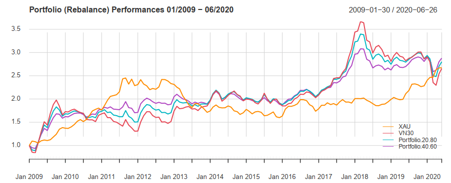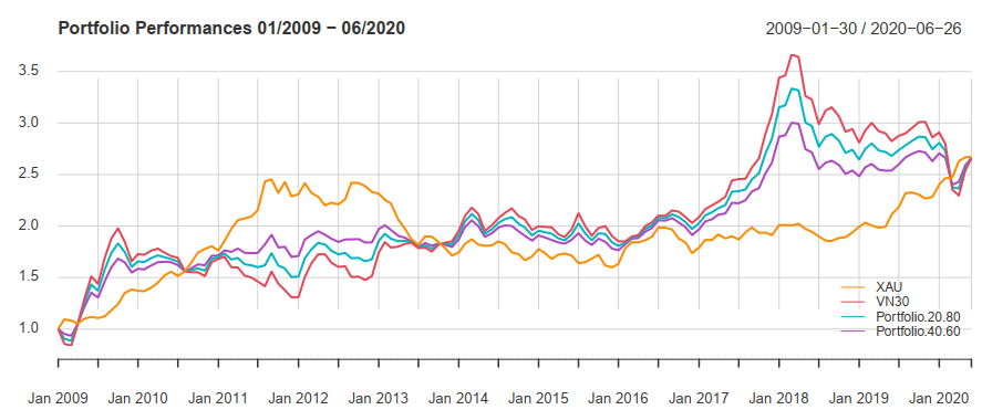 Trong trường hợp này, nếu nhà đầu tư kia đầu tư vào vàng năm 2017, bây giờ sẽ có tỷ suất sinh lợi lớn hơn 3 danh mục còn lại. Xét cả quá trình từ năm 2009 đến nay thì danh mục 40/60 trông thua kém danh mục 20/80 và VN30, nhưng nếu xét trong thời điểm từ năm 2017 về sau thì danh mục này hiệu quả hơn hẳn nhờ giá vàng liên tục tăng trong năm vừa qua.