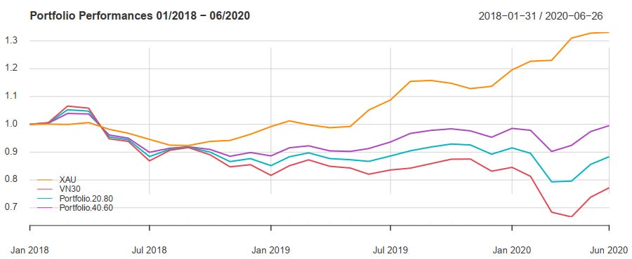 Dữ liệu cho thấy đầu năm 2020 thì cả 3 danh mục có đầu tư cổ phiếu đều giảm mạnh như nhau do tỷ trọng của cổ phiếu trong hai danh mục 20/80 và 40/60 lớn hơn vàng nên phải chịu sự chi phối.