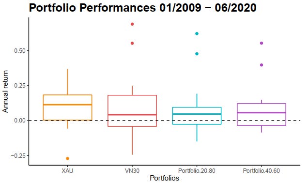 Qua quãng thời gian 2009 -> 2020, tôi thấy rằng danh mục 100% vàng mang lại tỷ suất sinh lợi tương đối tốt hơn 100% cổ phiếu. 3 danh mục có cổ phiếu mang lại tỷ suất sinh lợi (trung vị và trung bình) gần như nhau. Tuy nhiên danh mục 40/60 Vàng/Cổ phiếu lại có tỷ suất sinh lợi (trung vị) lớn hơn và rủi ro cũng thấp hơn danh mục VN30 rất nhiều.