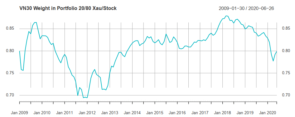 Biểu đồ trên cho thấy rằng tỷ trọng của cổ phiếu trong danh mục luôn biến động trong một quãng thời gian. Khi mà giá vàng đang tăng trở lại trong thời gian gần đây thì tỷ trọng đóng góp của VN30 trong danh mục cũng giảm dần và bật tăng trở lại khi trường "quay đầu" từ giai đoạn cuối tháng 3.