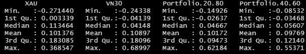 XAUVN30Portfolio 20/80Portfolio 40/60Annualized Return0.08920.08860.08880.0889Annualized Std Dev0.11970.20930.16800.1340