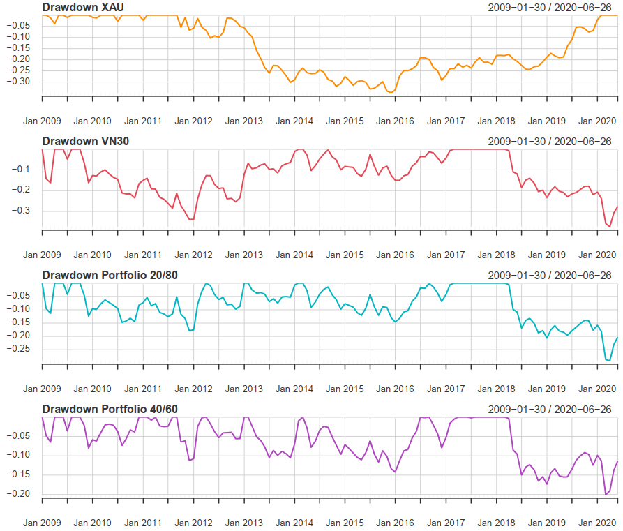 Hai danh mục 20/80 và 40/60 có thể thấy rằng, nếu tỷ trọng của vàng trong danh mục càng lớn thì drawdown càng thấp. Như Danh mục 20/80, drawdown trung bình tầm 15%, maximum drawdown là 29%. Trong khi đó danh mục 40/60 thì trung bình tầm 10%, maximum drawdown hiện tại là 20%.