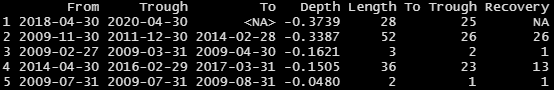 Qua dữ liệu biểu đồ trên và biểu đồ histogram đầu bài, tôi thấy VN30 rủi ro cao hơn XAU. Có nhiều đợt drawdown, maximum drawdown là 37%. Kế tiếp là đợt suy giảm cuối năm 2009, 33,87%. Một điều mà tôi thấy hơi thú vị đó là trong các đợt drawdown dài của VN30, thì giai đoạn từ đỉnh cho đến đáy là từ 23-26 tháng. Liệu có thể dùng dữ liệu này để phán đoán đỉnh đáy trong tương lai được không?