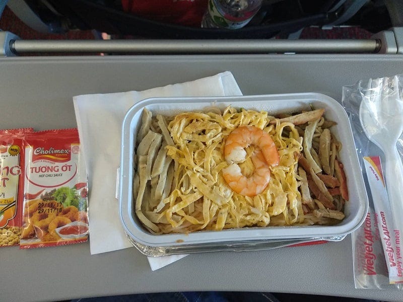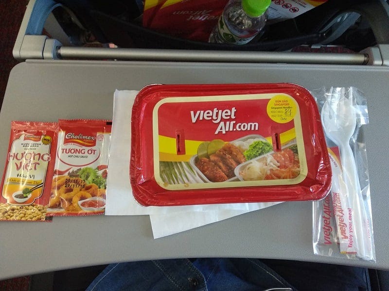 Lên máy bay, lần đầu tiên đi Vietjet Air nên gọi thử một suất đồ ăn của họ xem như thế nào. Tôi chọn món bún xào của nước gì quên tên mất rồi thêm 1 chai nước 75.000 đ hết, tôi đưa 500.000 cậu tiếp viên thối lại hẳn 525.000 do sơ ý. Không biết lỡ gặp người khác họ im im luôn thì cậu ấy có bị phạt không.
