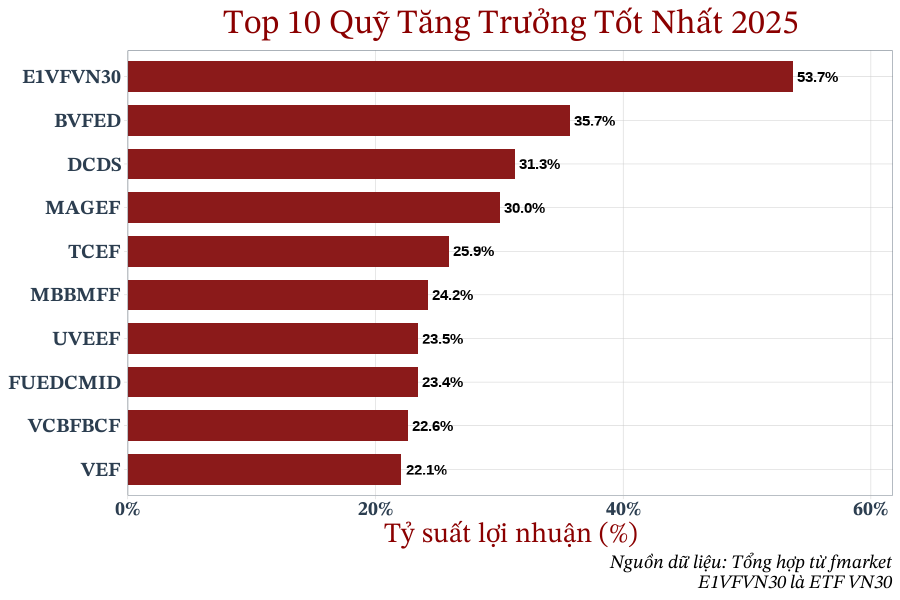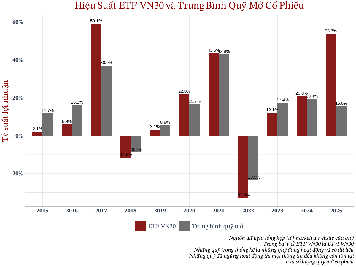 Nhưng mà nhìn vào năm 2025 để thấy cái giá đó. Trong khi ETF VN30 có tăng trưởng hơn 50% thì các chuyên gia quản lý quỹ mở chỉ thu về con số khiêm tốn trung bình 15.5%.