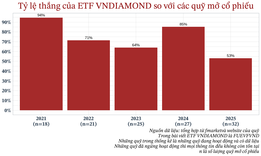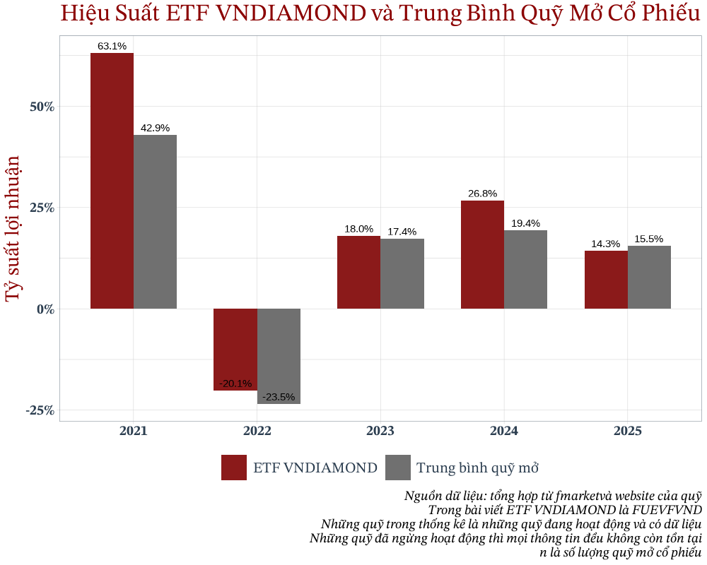 Năm 2025 ETF VNDIAMOND thua nhẹ so với trung bình và có tỷ lệ thắng thấp, chỉ 53% là do các cổ phiếu trong rổ VNDIAMOND bị chững lại hoặc dòng tiền luân chuyển sang nhóm khác