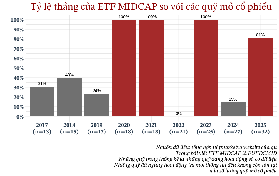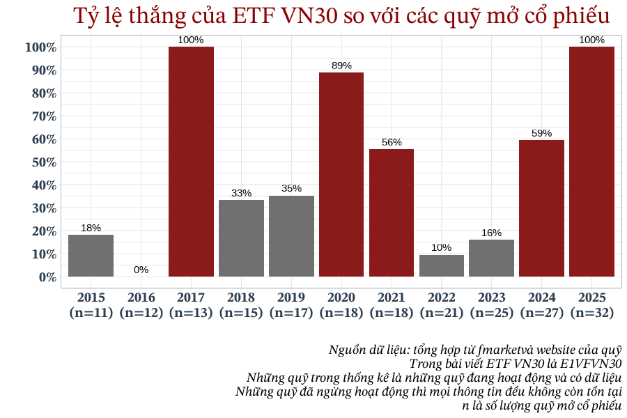 Năm 2017 và 2025: ETF thắng tuyệt đối (100%). Đây thường là những năm dòng tiền tập trung cực mạnh vào nhóm vốn hóa lớn. Trong những giai đoạn này, việc “kén cá chọn canh” của các quỹ chủ động lại trở thành rào cản khiến họ không theo kịp đà tăng của chỉ số chung.