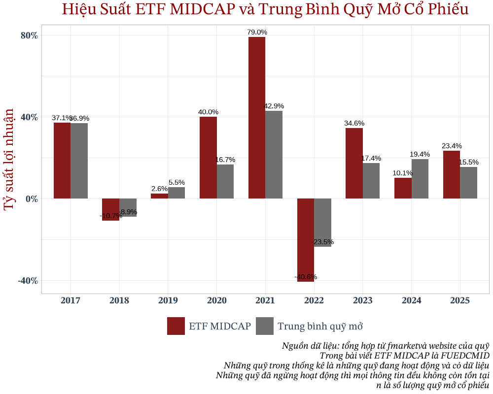 Khi thị trường vào uptrend thì các quỹ mở gần như không có cửa để đuổi theo ETF MIDCAP. Điều này cho thấy trong nhóm vốn hóa vừa, khi dòng tiền đổ vào thì các cổ phiếu tăng trưởng sẽ chạy rất nhanh và mạnh. Các quỹ mở với quy trình giải ngân và quản trị rủi ro chặt chẽ thường không thể all-in hoặc phản ứng kịp với tốc độ tăng trưởng này nên dẫn đến việc bị bỏ lại phía sau với khoảng cách rất lớn.
