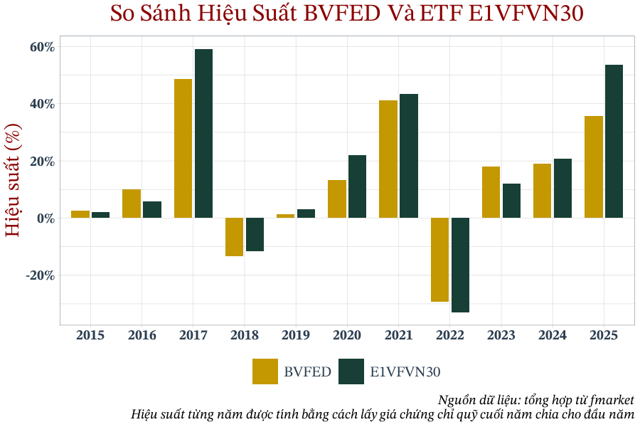 Lý do là vì trong xuyên suốt 11 năm qua, chỉ có 4 năm là BVFED thắng được ETF E1VFVN30: