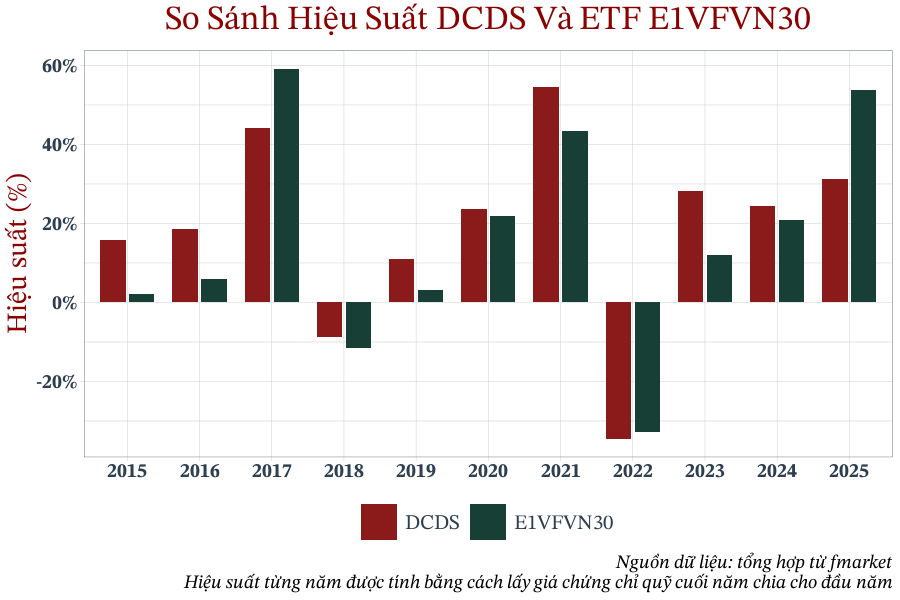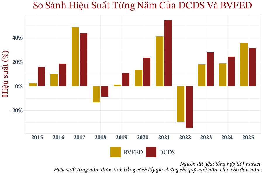 Lý do tôi gọi là may mắn bởi vì quỹ DCDS chiến thắng quỹ BVFED 8/11 năm qua, tỷ lệ hơn 70% nhưng vì một yếu tố độc lạ mà danh mục của họ có hiệu suất vượt trội hơn so với DCDS. Và như tôi đã nói ở trên, những yếu tố may mắn hiếm có thể lặp lại đi lặp lại cho nên nếu bạn đọc nào đọc báo cáo năm 2025 rồi nhảy vào mua BVFED thì nên cẩn thận.