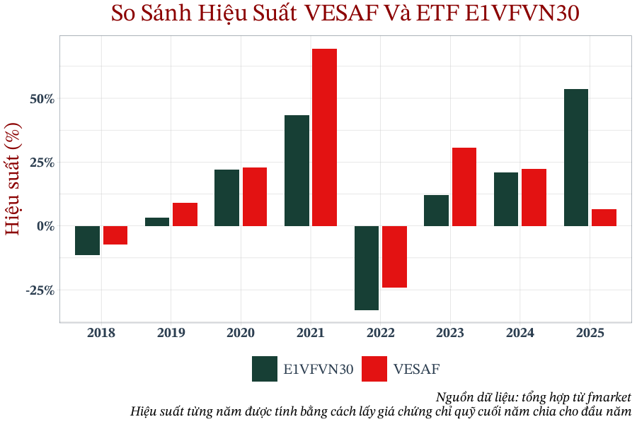 VESAF dù vượt trội và có tỷ lệ thắng 7/7 vào năm 2024, nhưng năm 2025 quỹ lại có hiệu suất thấp, một phần là do DGC chiếm tỷ trọng cao và danh mục không có cổ phiếu đẩy danh mục do tránh VIC và Gelex.