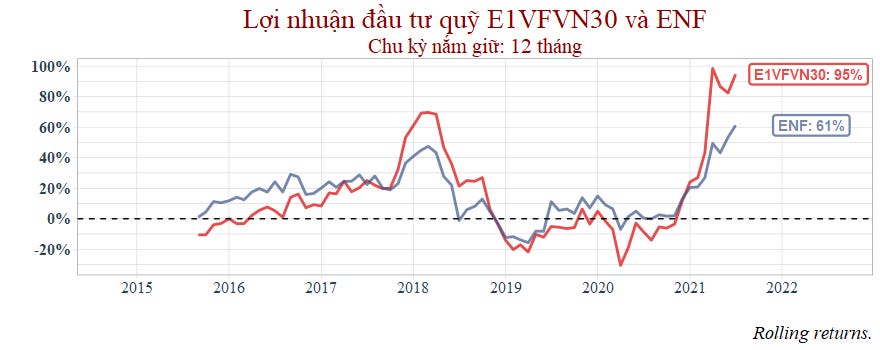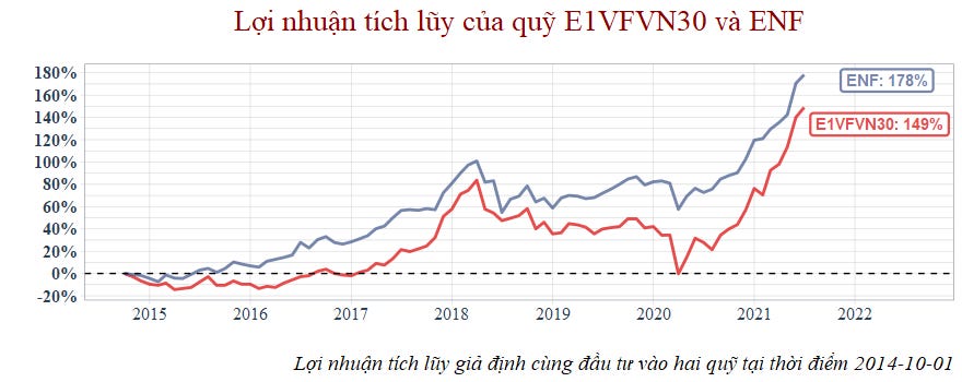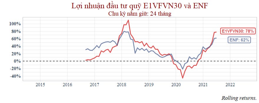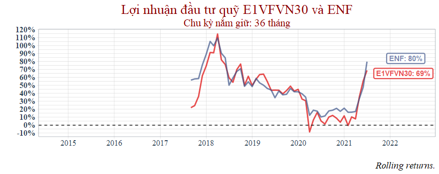 Dựa theo biểu đồ lợi nhuận tích lũy, giống như các quỹ mà có thời gian hoạt động từ năm 2016, quỹ ENF cũng ghi nhận tỷ suất sinh lợi tốt hơn ETF giai đoạn 2016 đến 2017.