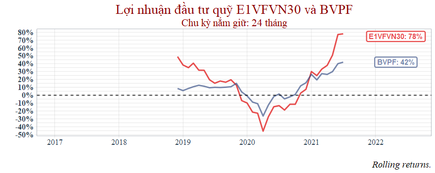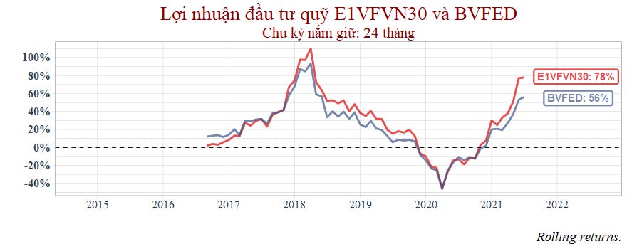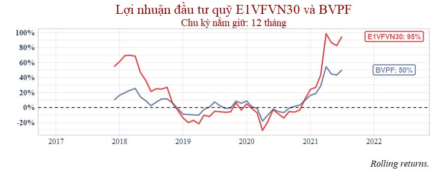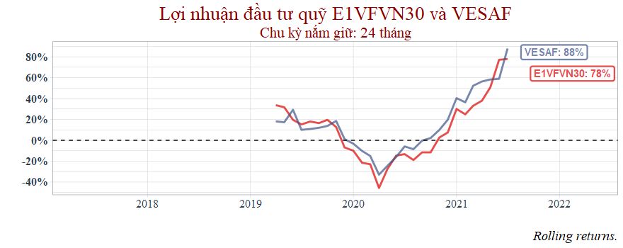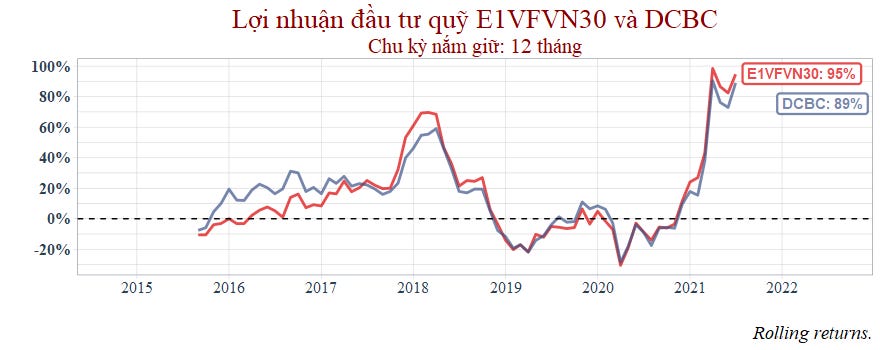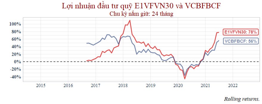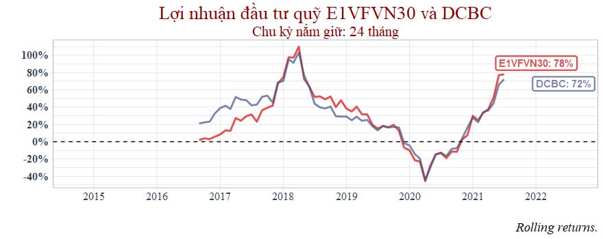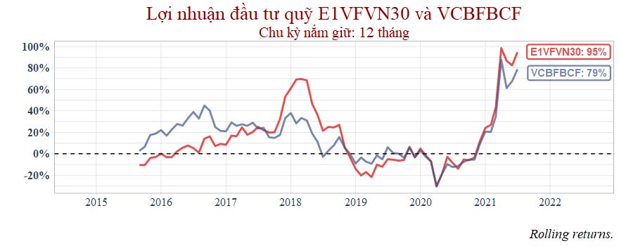 Thời gian còn lại với chu kỳ nắm giữ 1 năm thì hai quỹ tương đương nhau nhưng đến 2021 thì VCBF bắt đầu hụt hơi.