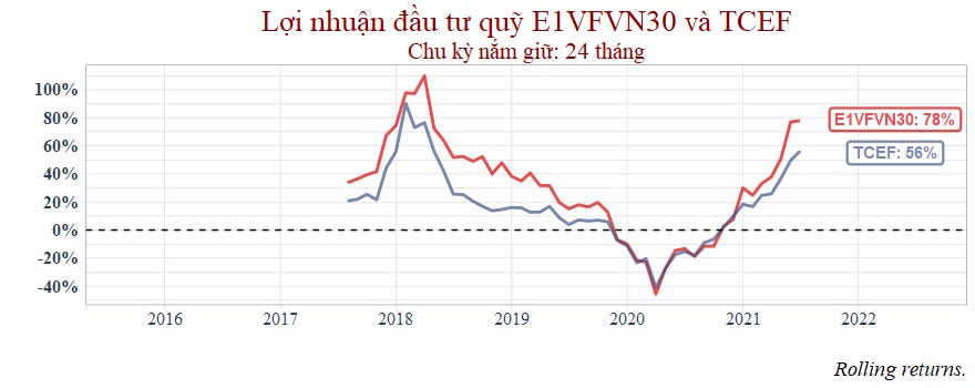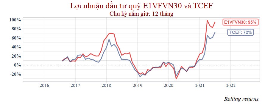 Có thể thấy rằng TCEF đã thua toàn diện so với ETF E1VFVN30 cho dù có đầu tư vào thời điểm nào đi nữa.