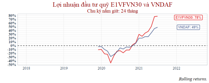 Nếu so sánh với ETF E1VFVN30 thì VNDAF mang lại lợi nhuận thấp hơn.