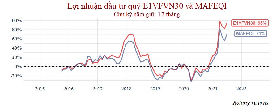 Với biểu đồ Rolling returns này, thời điểm năm 2018 E1VFVN30 đạt lợi nhuận khoảng 60% thì có nghĩa rằng nhà đầu tư mua cách đó 12 tháng (tức 01/2017) và nắm giữ tới 01/2018 thì sẽ có lợi nhuận vào tầm 60%. Cứ thế tiếp tục tính 02/2017 đến 02/2018, 03/2017 đến 03/2018...